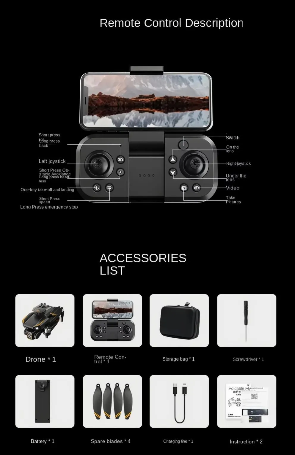 1*Drone 1*Remote Control 1*Storage Bag 1*Battery 4*Spare Blade 1*Charging Cable 2*Instruction 1*Screwdriver