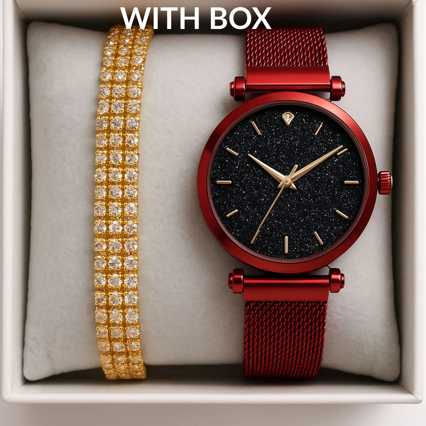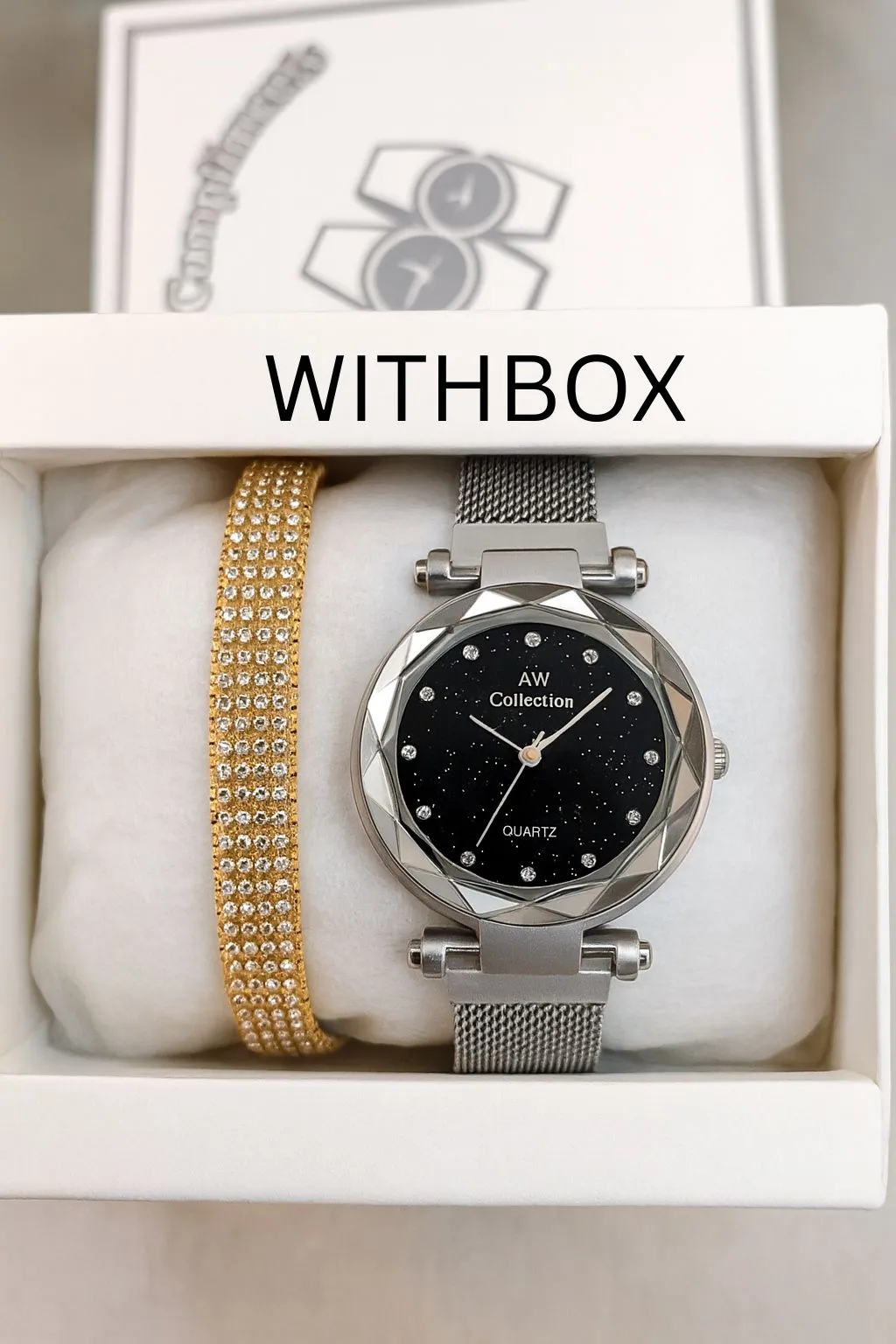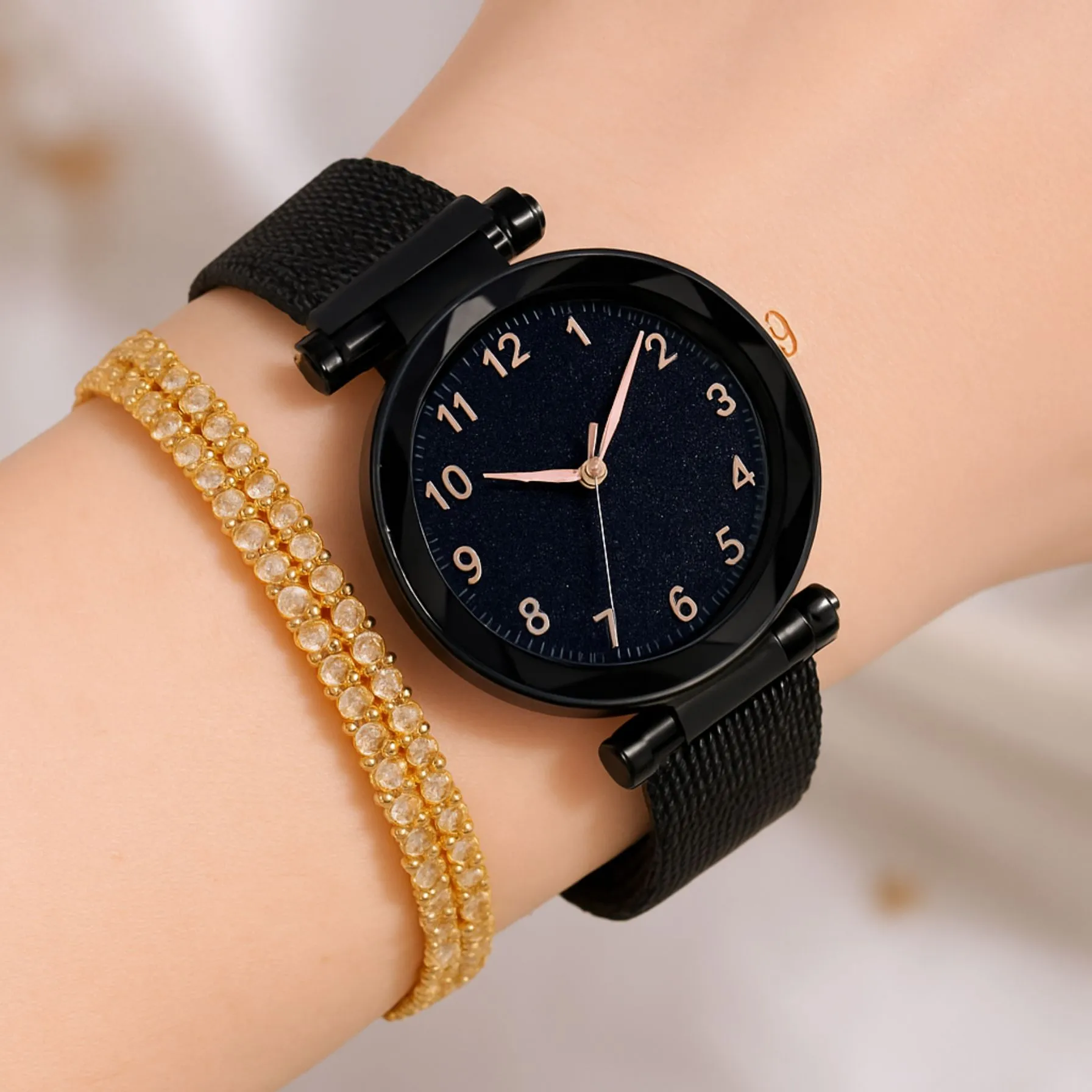 Discover elegance and functionality with this stylish magnet watch for girls, a perfect combo that includes 2 magnetic strap watches and a beautiful matching bracelet, all neatly packed in a gift box. Whether you're dressing up for school, college, casual hangouts, or special events, this watch set adds charm to your everyday style.